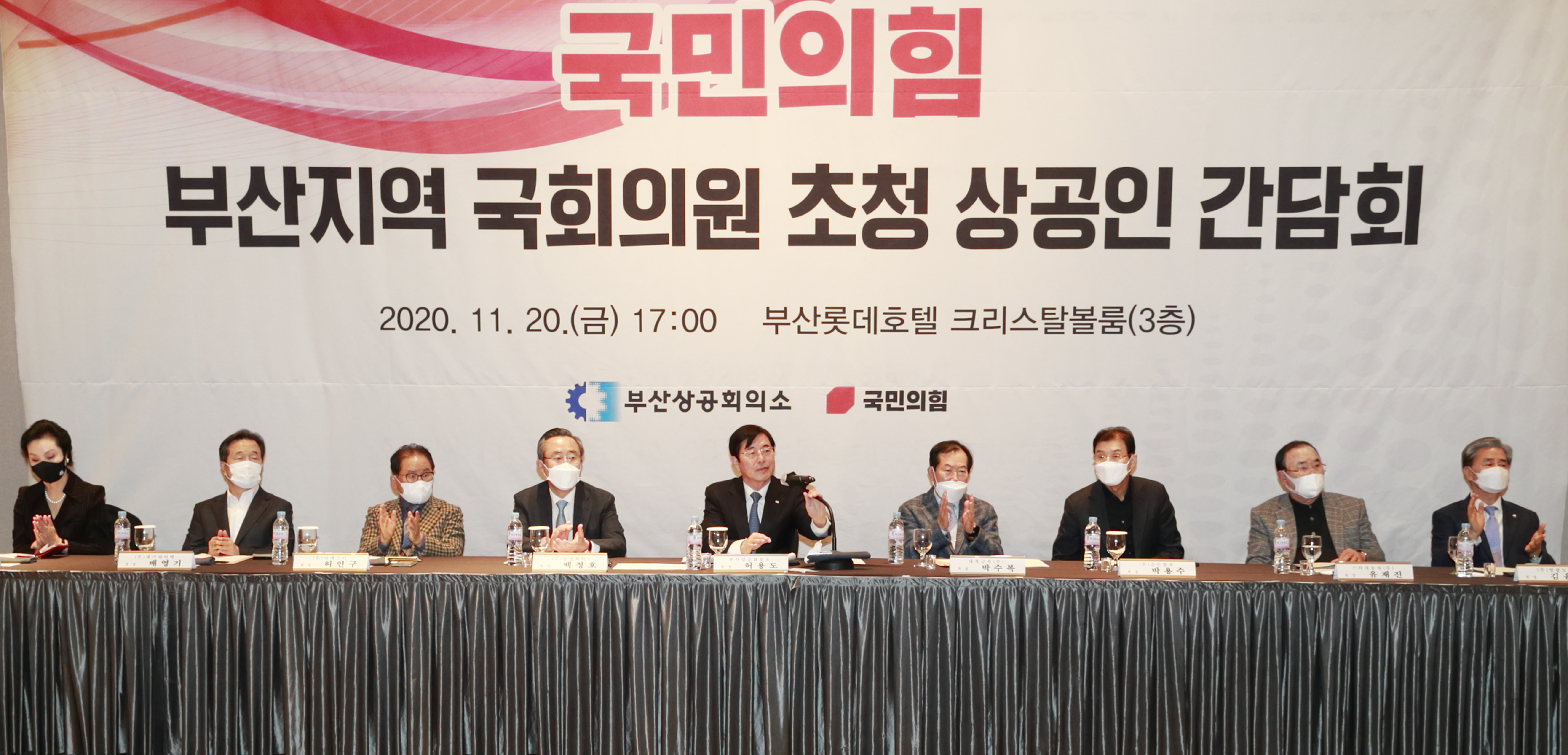 간담회에는 부산상의 허용도 회장을 비롯한 60여명의 지역 상공인들이 참석하였으며, 국민의힘에서는 하태경 부산시당 위원장과 서병수, 김도읍, 김미애, 이헌승, 황보승희, 안병길, 이주환, 전봉민 의원 등 지역 국회의원 9명이 참석했다.
