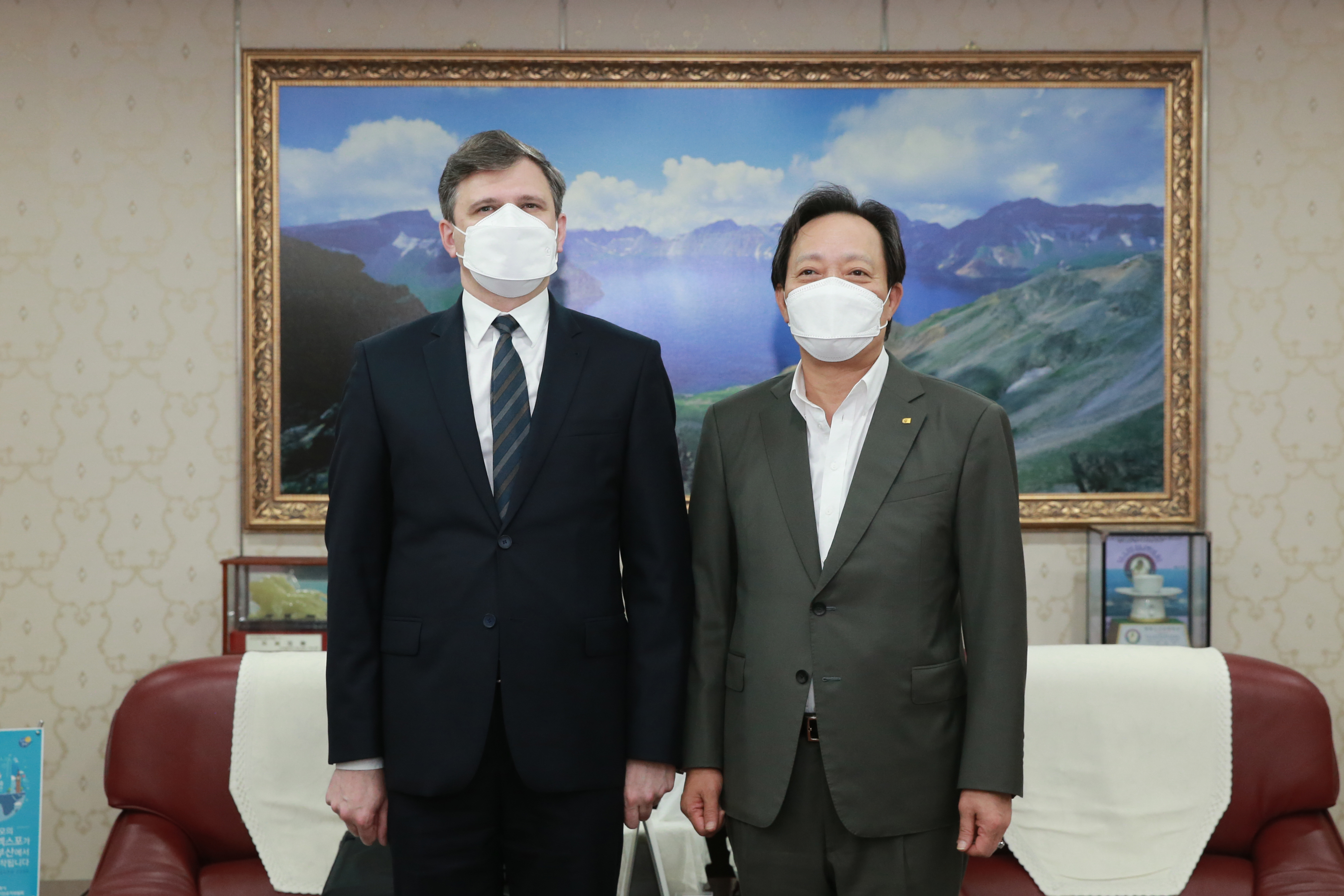 부산상의 장인화 회장은 벨라루스 대사와 상무관을 접견하고 부산상의와 우호증진 및 협력방안을 모색하고자 했다.