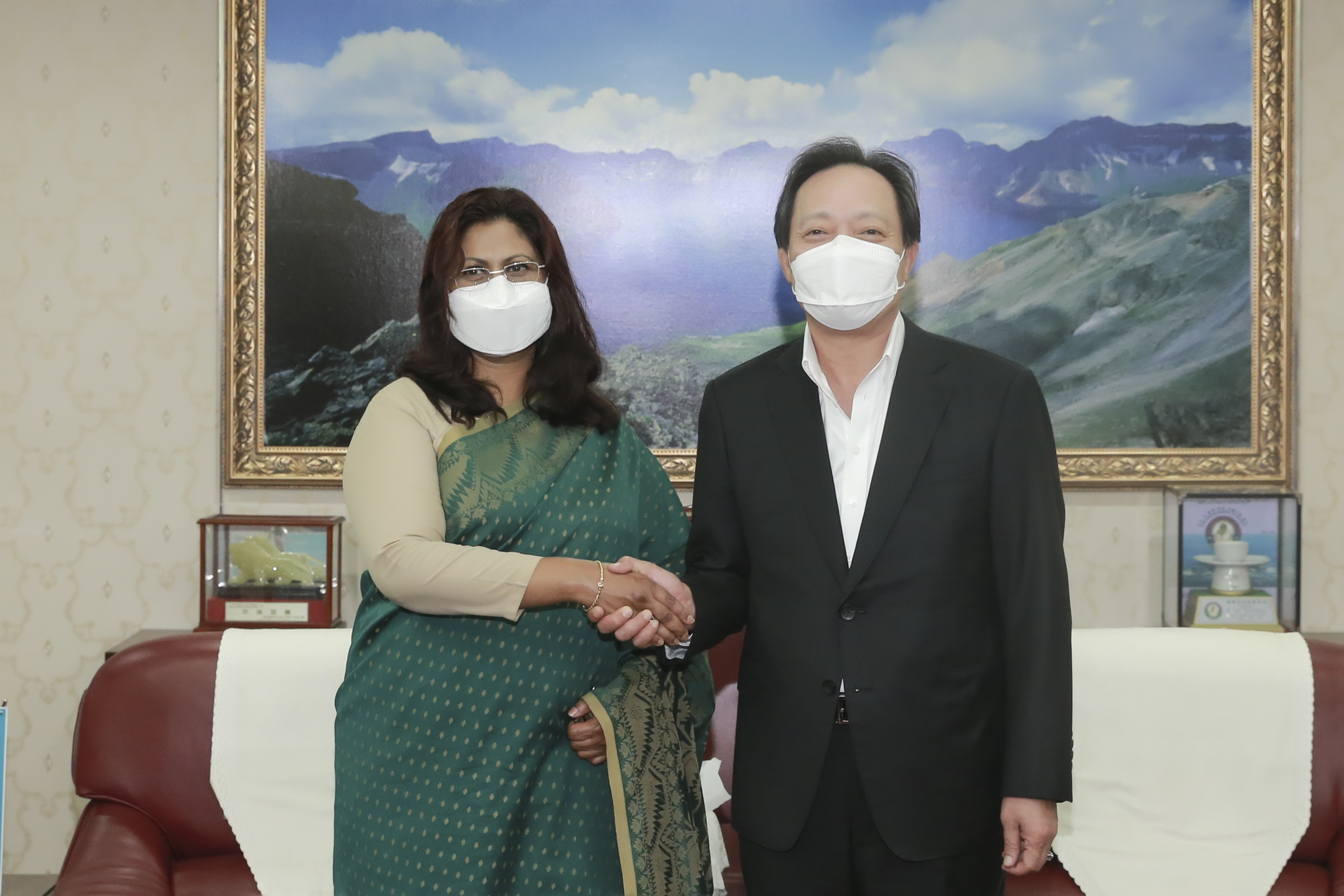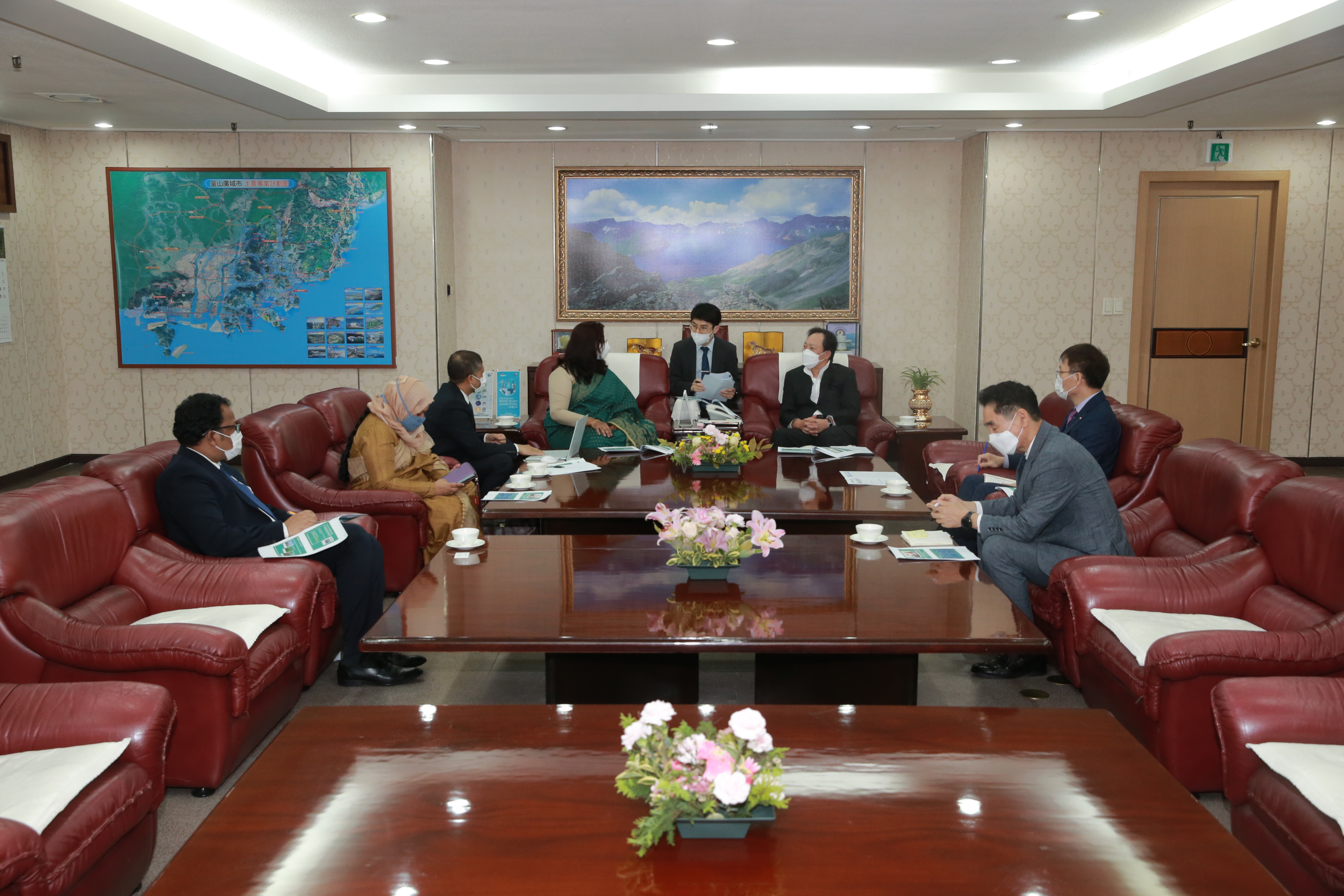 부산상공회의소 장인화 회장은 6원11일(금) 오후 16시 부산상의를 예방한 주한 방글라데시 아비다 이슬람 대사와 미자눌 라흐만 상무관, 모키마 베굼 노무관, 사무엘 물무 서기관을 접견했다.