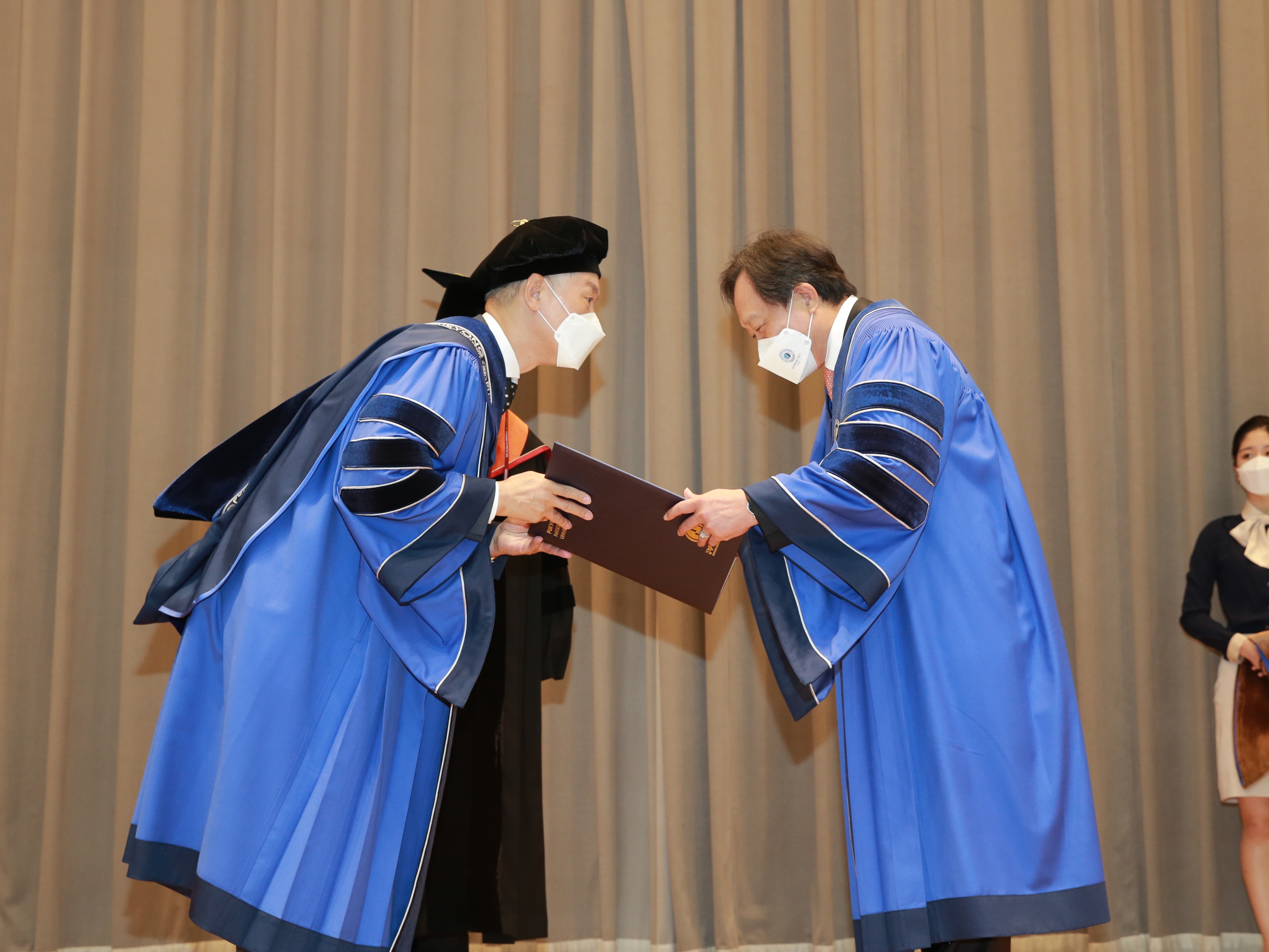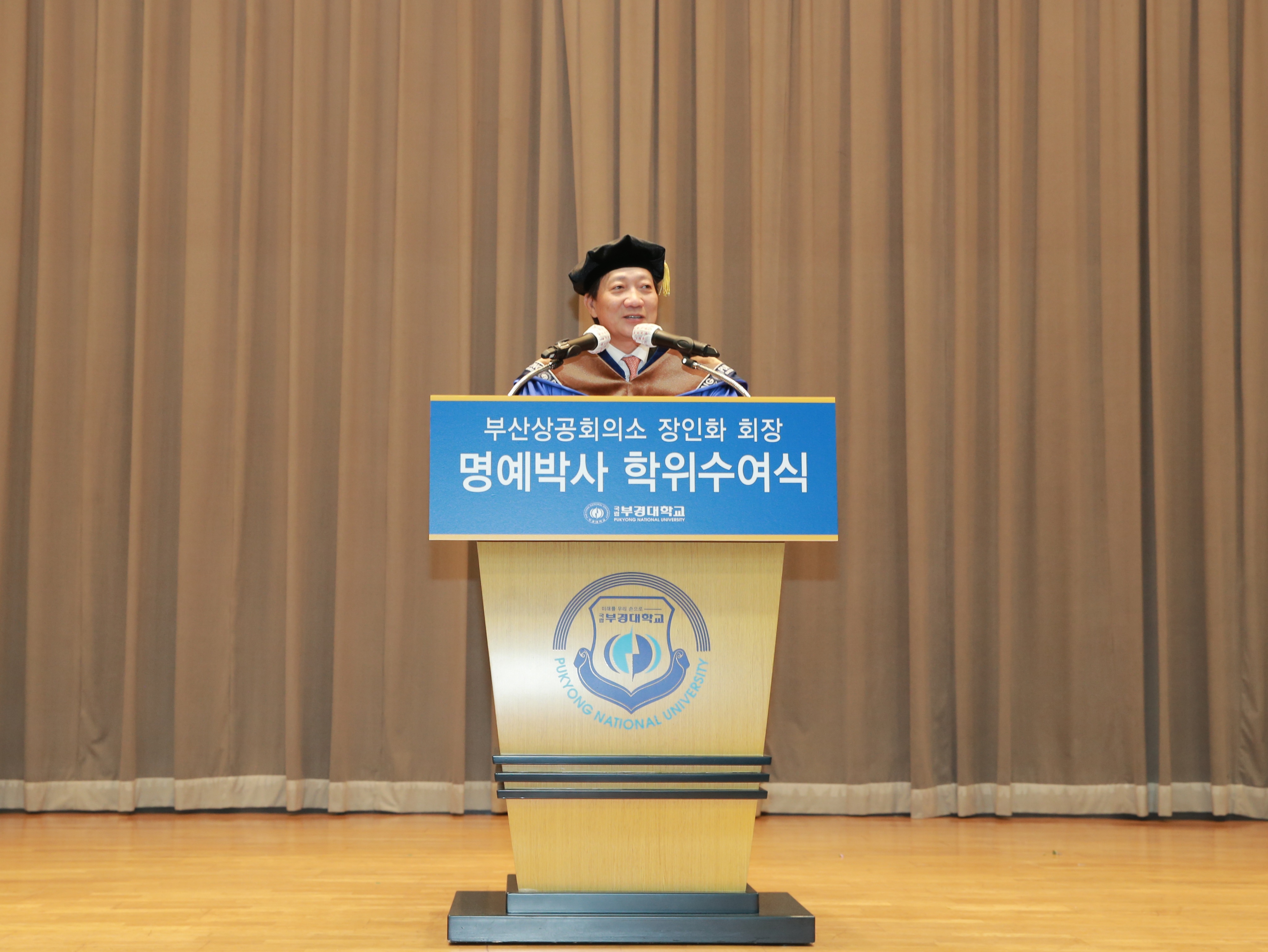 부산상공회의소 장인화 회장은 6/29(화) 오전11시, 지역 기업인들과 부산시체육회 간부 등 100여명의 축하객이 참석한 가운데 부경대학교에서 열린 학위수여식에서 명예 경영학 박사 학위를 취득했다.