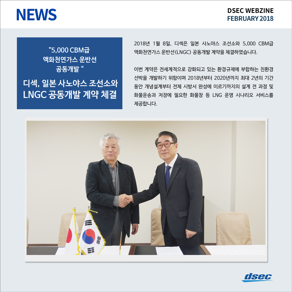 (주)디섹은 지난 1월 8일(월) 일본 사노야스 조선소와 5천CBM급 액화천연가스 운반선(LNGC) 공동개발 계약을 체 결하였다. 이번 계약은 전세계적으로 강화되고 있는 환경규제에 부합하는 친환경 선박을 개발하기 위해 이루어졌으며 2018 년부터 2020년까지 최대 2년의 기간동안 개념설계부터 전체 시방서 완성에 이르기까지의 설계 전 과정 및 화물 운송과 저장에 필요한 화물창 등 LNG 운영 시나리오 서비스를 제공하게 된다.
