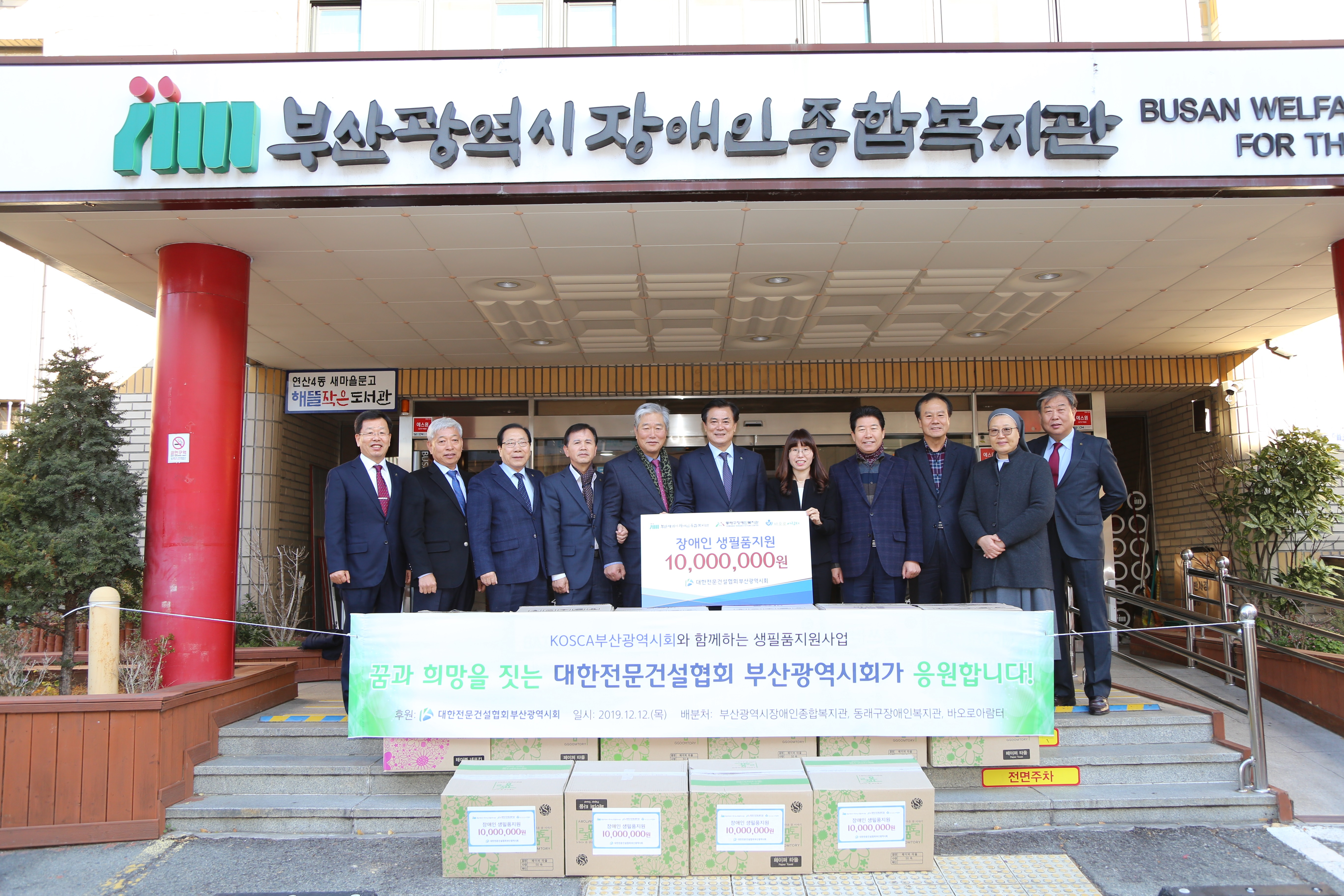 대한전문건설협회 부산시회는 지난 12월 12일(목)에 “부산광역시장애인종합복지관, 성바오로애덕원 바오로아람터, 동래구장애인복지관” 등 3곳의 기관을 방문하여 1,000만원의 생필품을 전달했다.